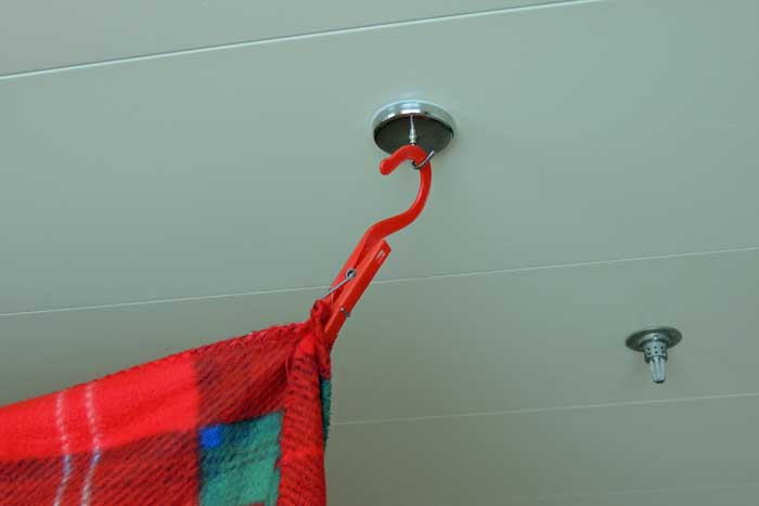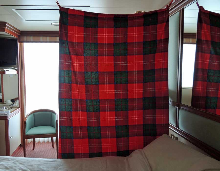 I am actually quite proud of this one. My wife likes to sleep in - I am often up before dawn and the desk light, TV or open curtain shines right in. The magnet hooks came from Lowes and are quite strong. The clips are old hanger type clothespins that are in my kit, but had never been used. For my next trip, I got 6 small black springy clips from an office supply store. They are smaller, but strong enough to hold the blanket. The blanket is from the Movies Under the Stars on-deck on the Princess. I plan to try some black plastic and see if it cuts more light - and see how large an item it is when folded. I left the magnets on the ceiling, and the blanket took about 10 seconds to mount, de-mount and store in the closet. A third magnet and clip would be needed to use two blankets for the full-suite experience! Update: First, I swapped the clothes pin part for some of those springy black clips with the fold down handles - they are more compact (those office clips come in several sizes) and quite strong to pinch the towels or movie blankets.. Second update. I saw on Cruise Critic where someone took blackout curtains (the kind with the big holes at top to thread through a curtain rod) - and hung one of those, using 3 or 4 strong magnets. While that means bringing your own curtain (or two panels or more) you might then be able to create a full two room suite! I feel like the package we once got was pretty light weight, but the curtains (claimed to be blackout) worked well. |
