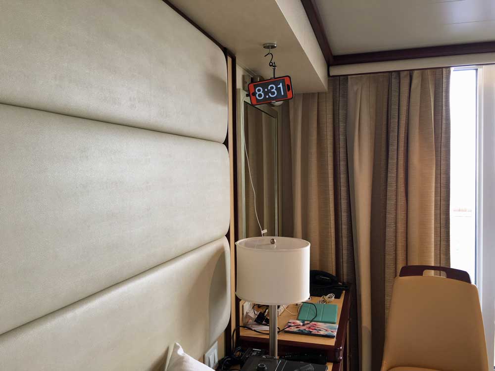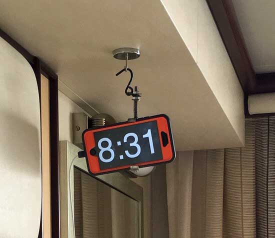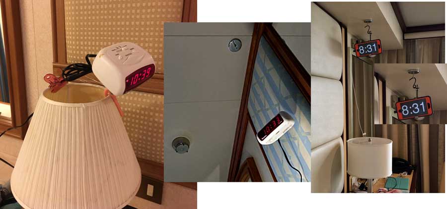 see without having to raise way up in the bed. The first attempt was OK. It was a very small clock to which I attached a nylon fishing line to hang the clock from the ceiling. Drilling holes in the side of the clock was "iffy" but allowed me to tie the fishing line firmly. A variation of that original idea was the same clock perched on the top of the bedside lamp. I removed the battery cover on the bottom (if the power goes off, the light does not stay lit anyhow) and wedged a block of wood in the battery space, drilled a hole in the block of wood, and made a V shaped wedge out of a plastic coat hanger. That slid over the lamp shade. I used a clip to hold the cord in place since the clock wanted to shift and spin around. It could be seen by anyone on either side of the bed, but was not very stable. I felt I HAD to put this away each morning to not freak out our cabin steward. |