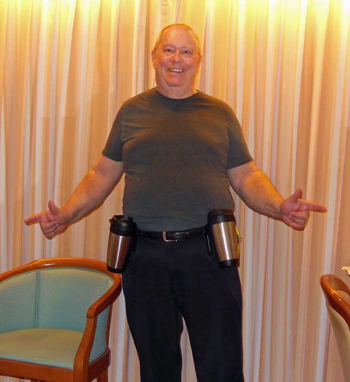 pants or belt. Wearing them as shown in the picture tends to amuse the staff no end - both one one side may be less "western". This is great for being able to carry a plate of food AND open the cabin door at the same time. |