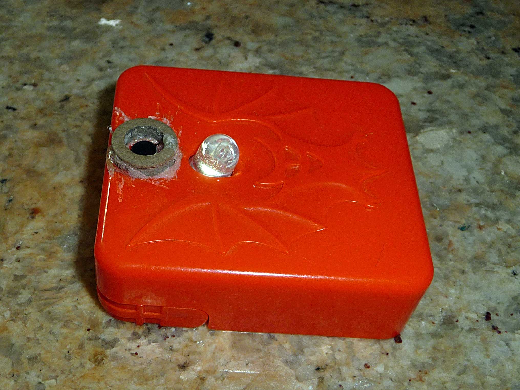your pumpkin's innards, or your bathroom. Additionally, the goopy thing on the left side is where I glued on an old rubber washer thing to make it harder for the push button to accidentally turn on in my shaving kit. I also mark the date when I replace the batteries (a piece of masking tape inside the battery door) - they should last for months, but I like to refresh them when I think it has been a while. |
