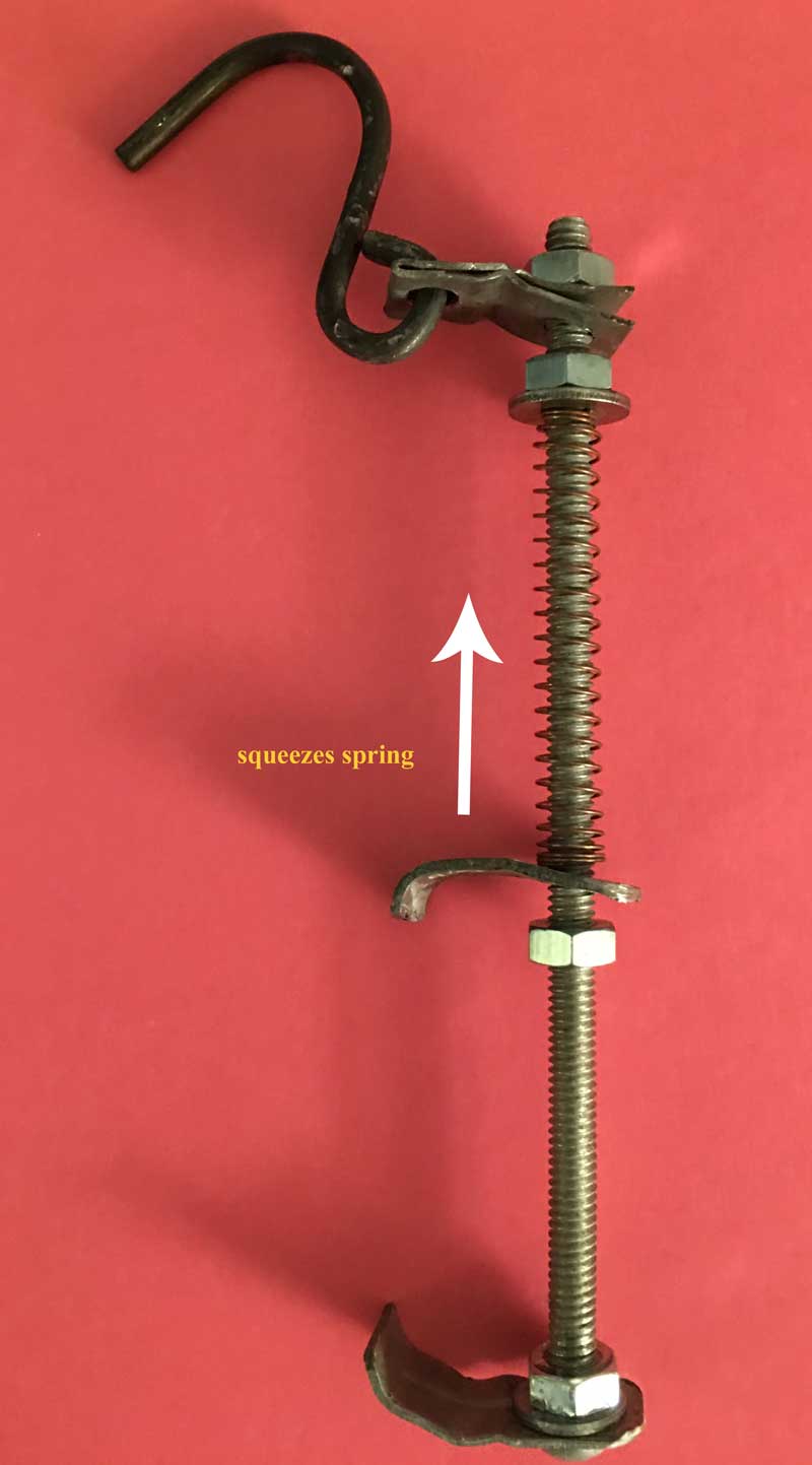 down the battery. There are lots of free clock apps, but this one seems good, is fairly compact and has two important features - one, it has a button to LOCK the screen (otherwise it goes off when the phone wants to go black) and the other is a dimmer slider - the picture shows the screen bright, but at night, very dim is plenty bright enough. The app is called NIGHTCLOCK I took the phone down each morning but left the magnet on the ceiling. It took about 5 seconds to put it back in service at night. The grabber that I made should have been available at a store, but this phone was too big so I made my own from a long bolt and some scrap metal in my garage. The bottom grabber was squeezed by the nut (along with a gob of glue) since both it and the top grabber wanted to spin around and not stay lined up. With the bottom one in a fixed position, the upper one could be stretched and lowered in place easily. We had a 5 foot or so charging cord so we had options on where to place the clock. |